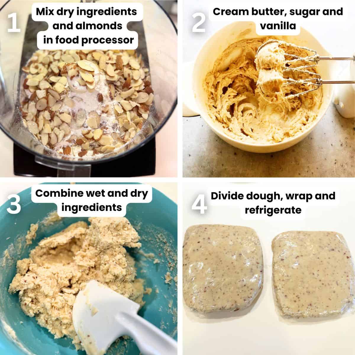 - In a food processor, mix all purpose flour, toasted almonds and salt and pulse until the almonds are finely ground.2 cups all purpose flour, 1 cup almonds, ½ teaspoon kosher salt