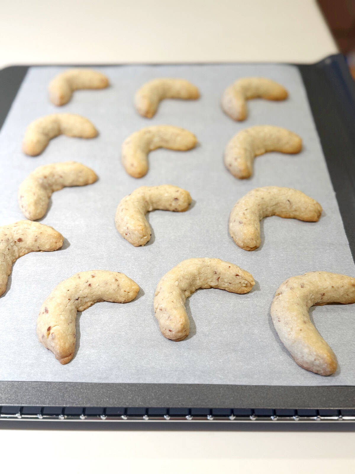- Gently form crescent shapes with the dough by bending the log and pinch the ends of logs to make the crescent shape.