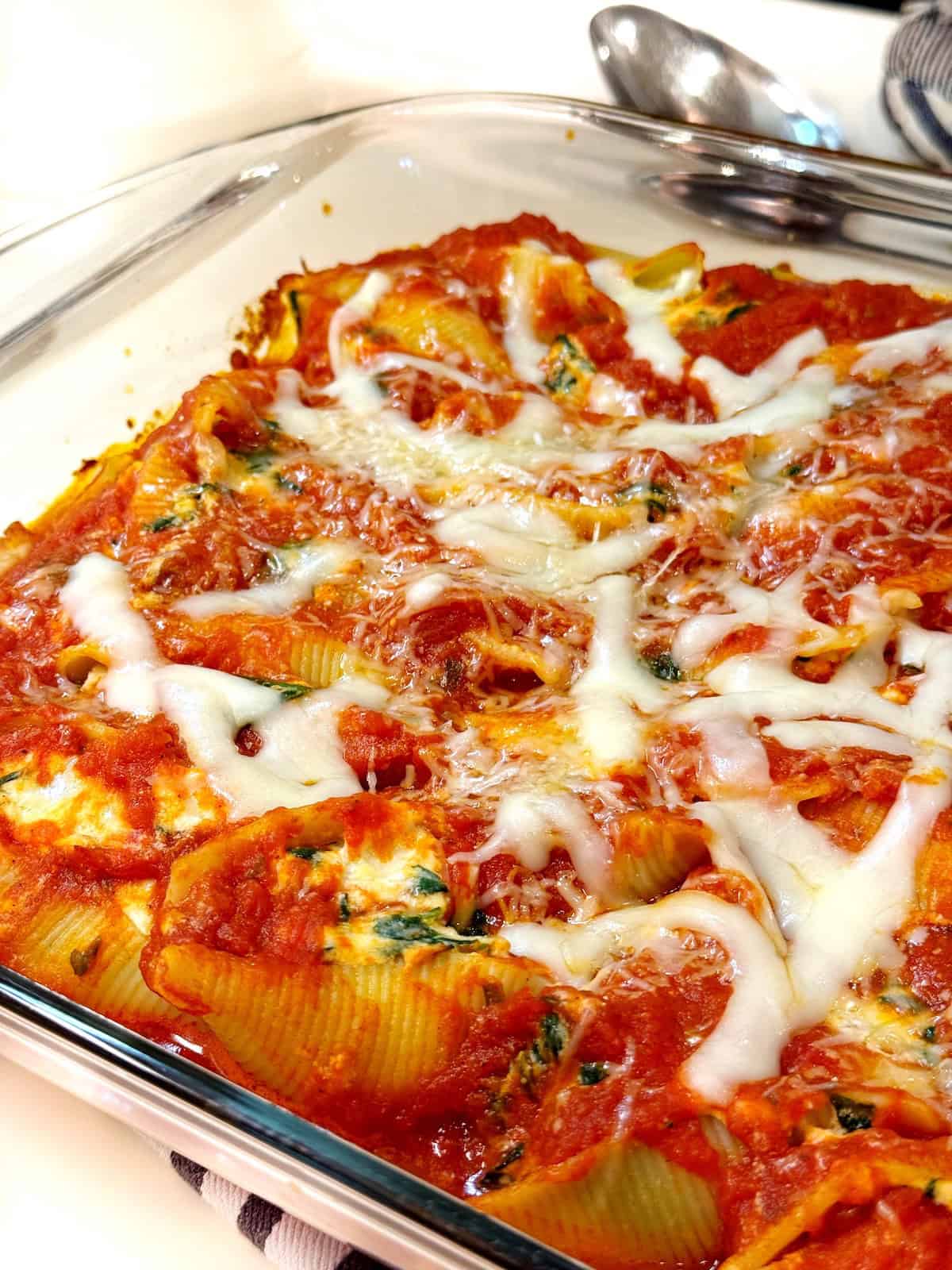 - Assemble in a baking dish: line the baking dish with marinara then add the shells and top with more marinara and the mozzarella cheese.