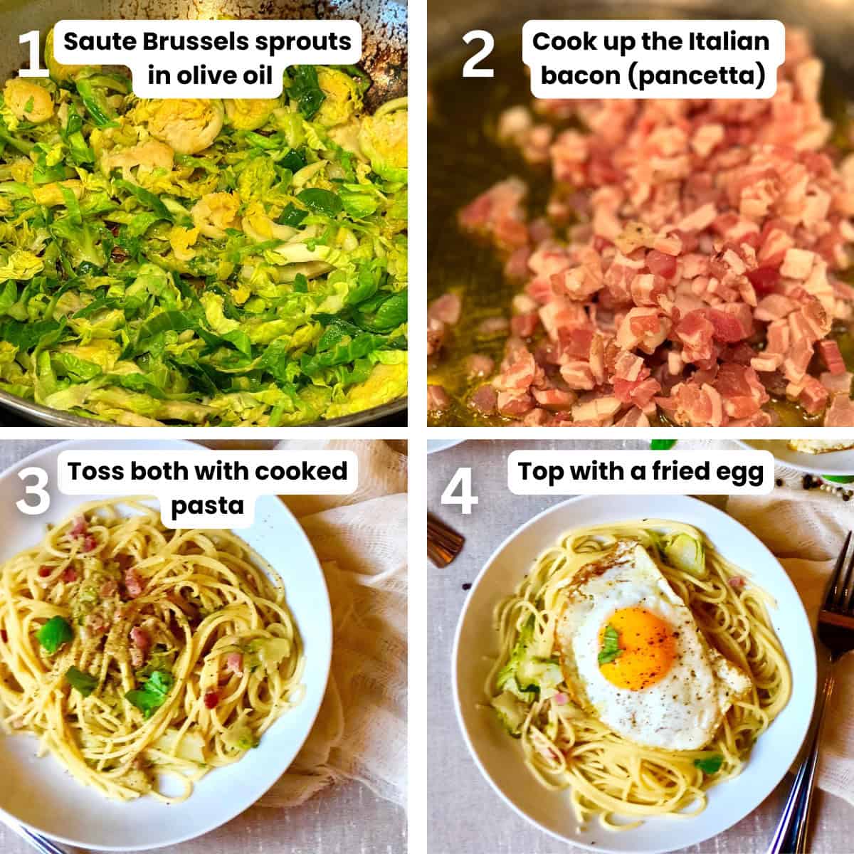 - Assemble: Toss the Brussels sprout, bacon and a little pasta water and cook on low heat for a couple of minutes.