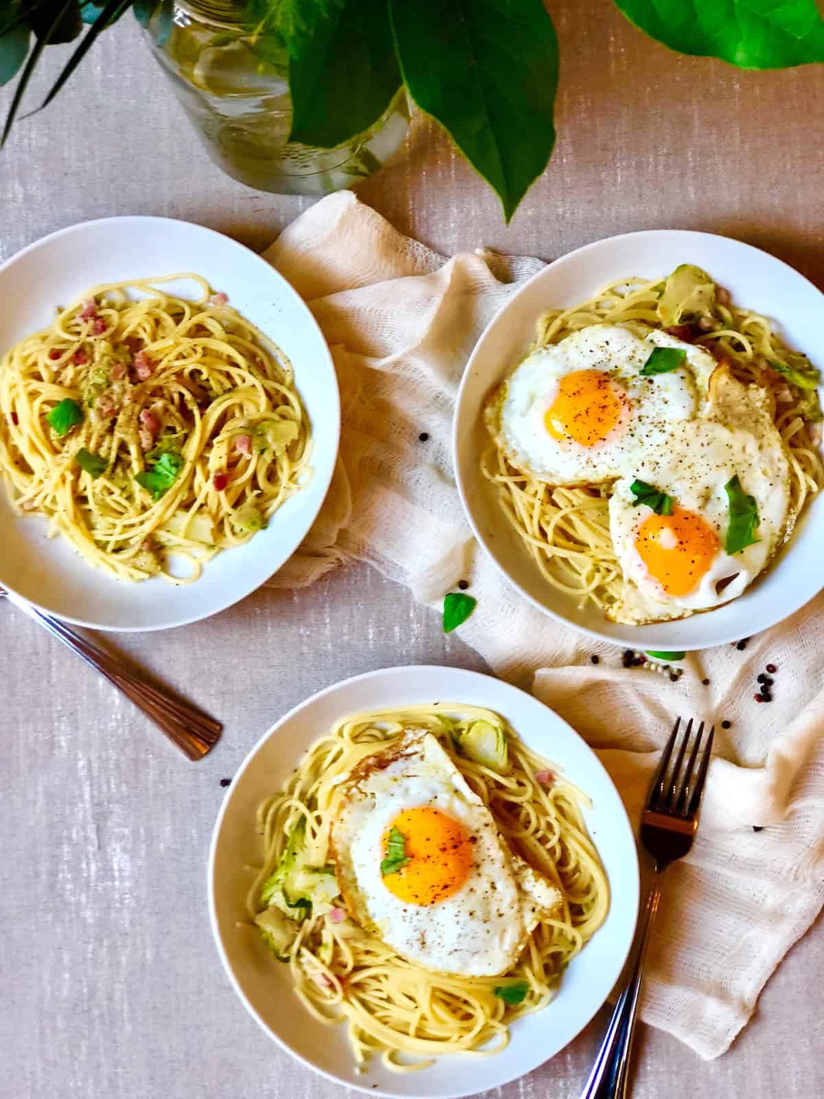 - Eggs: Now you can leave this out entirely and the pasta will still be delicious but I do love the addition. I fry up the eggs on the side and add them to the pasta before serving. Some people in my family like one egg some two.